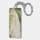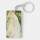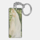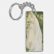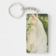 This image portrays an elegant bride standing gracefully in a lush, sunlit garden. She wears an ivory wedding gown adorned with delicate lace, subtle beading, and a softly gathered waist accentuated by a jeweled brooch. A long, translucent veil cascades behind her, catching the light and adding a sense of movement and ethereal beauty. The bride gazes gently downward at a cascading bouquet of white lilies and greenery, her expression calm and contemplative. Surrounded by dense foliage and tall trees rendered in soft, painterly tones, the scene evokes a romantic, timeless atmosphere inspired by classical illustration and Art Nouveau aesthetics.