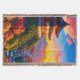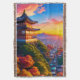 Ett japanskt tempel som ligger på en högtrappa, som ger en bild av staden och bergen under solnedgången.