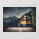 En brinnande nattscen med en stor gyllene pavilion belyst mot ett stjärnande himmel, ett härdat amidst mistberg och en handdukande bambu. Förgrundsrundan av trä tillför denna lugnande inställning värme, genom att bjuda in tittare till ett ögonblick av fred och reflektion inspirerad av traditionell japansk arkitektur och naturens skönhet.