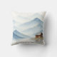 A tranquil watercolor throw pillow featuring soft blue, misty mountains and a rustic cabin. Perfect for adding a peaceful, minimalist, or cozy rustic touch to your sofa or bed.