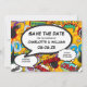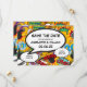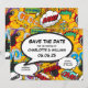En rolig, cool och trendig serieinspirerad spara datum-kort som sätter BAM, ZAP, POW i din bröllopsinbjudan. Baksidan har ett matchande seriemönster som du kan ersätta med din egen bild eller foto. Designad av Thisisnotme