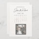 Spara datum-kort med markerat datum på kalenderlayout, med serietidningsstil frimärke illustration som visar bild på lyckligt bröllopspar.