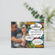 En rolig, cool och trendig retro-serie popkonst-inspirerad bröllopsbudgetinbjudan som sätter bam, zap, pow i alla superhjältepars firande evenemang. Baksidan innehåller din RSVP, boende och ytterligare detaljer. Designad av Thisisnotme©