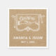 Lantliga brölloppappersservetter med det utskrivavet burlapfotoet och vitvintagekonstverk av händer som sätter vigselringen på fingret.