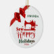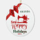 Sewing Enthusiast Glad helg Ceramic Ornament. En sydd maskin med stjärnor och Sew Lycklig. Helgdagar och ett rött båge som lagts till i konstruktionen samt namn och år. Underbar gåva till den som kärlek ska syna. Röd och grönt prydnadsämne förbättrat med en röd båge överst och längst bak. Anpassa med ord Helgdagar, namn och år. Med stjärnor och manusgrafi lägger du till den prydnadsande färskheten i ge. Du kan också anpassa baksidan med namnteckning namn.