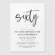 Denna moderna, svarta och vita, 60:e födelsedagsfest inbjudan har en klassam modern typografi. Ord "60" visas i skriptet stil calligraphy. Perfekt för att ange snyggtens ton för ett underbart, sextionde födelsedagsfestens firande. Det är lätt att anpassa färg-systemet i inbjudan - både bakgrunden och typografin - så att man kan känna sig fri från plocka av ett skräddarsytt tvåfärg-system eller hålla sig till det klassiska, minimalistiska svartvita. Finns som Zazzle-inbjudningar med många olika alternativ och fantastiska pappra lagrar eller som en digital fil för omedelbar nedladdning som du kan skriva ut själv, om du har bråttom! 60 såg aldrig så bra ut!