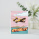 Seychellerna tecknad stil-vykortskonst för resor på ett stödflygplan som flyger till öarna.
