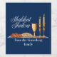 Shabbat Shalom vin-etikett i vackert blått med elegant skriva skript ovanför en underbar Shabbat middag med utmanahbröd, vin och ljus. Må ni ha många välsignelser. Anpassa den här presenten med din familj namn för en bra Sabbath.