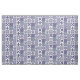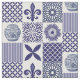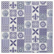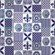 Blått och vitt lapptäcke av shabby chic, mönstrat med ginger burk, solblommor, loppur de lys lillies och moroccan trellis plattor.