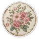 A circular wreath of blush‑pink blooms and tender green leaves sits at the center, painted with a gentle, vintage delicacy. The flowers—reminiscent of old‑garden roses—feel both lush and slightly faded, as if touched by years of sunlight. Surrounding the bouquet is a cream background with a distressed, tea‑stained texture, framed by a softly weathered brown border that gives the entire piece an antique, well‑loved character. The overall effect is warm, romantic, and nostalgic—classic shabby chic with a whisper of French country charm.