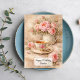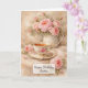 En mjuk illustration i vintage-stil med en ömtålig tekop och fat åtföljd av en bukett rosa rosor. Skånsamma pastelltoner, spetsstrukturer och blomsterdetaljer skapar en romantisk shabby chic komposition inspirerad av klassiska tescener.
