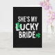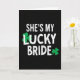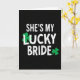 Det här kortet har en djupsvart bakgrund med frasen ”SHE'S MY LUCKY BRIDE” centrerad i tre rader med strukturerad vit text, vilket ger bokstäverna ett lätt väderbitet utseende. Orden sitter tätt ihop som ett självklart tillkännagivande, och layouten känns intim, som om någon stolt proklamerar sin favoritperson. En ljus smaragdgrön shamrock ersätter ”U” i ”LUCKY”, vars tre hjärtformade blad formar kurvan och tillför en romantisk blinkning 💚. En annan mindre shamrock visas som en snygg accent strax efter ”BRIDE”, likt en liten utsmyckning i slutet av en skål ☘️. Den starka kontrasten mellan den svarta bakgrunden och den vita texten gör att budskapet är lätt att läsa på avstånd, medan de gröna detaljerna drar ögat till sig för en närmare titt. Den vita texten är konsekvent genom alla tre rader, med shamrockarna som den enda färgklicken, så designen känns fokuserad och tillgiven utan att behöva extra grafik. Centrerat på kortet