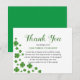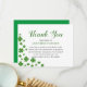Irskt tema tackkort med traditionell vit bakgrund och en spridning av gröna shamrockklöver med texten "Tack" och ett personligt tackmeddelande från familjen att skicka ut till vänner och familj som har visat dig vänlighet under din sorg