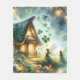 A dreamy cottagecore scene unfolds beneath a swirl of glowing shamrocks, soft lantern light, and whispery dandelion seeds drifting through a twilight meadow. Two tiny fairies rest beside a warm, thatched cottage, their luminous wings catching the soft teal and golden hues that dance through the misty night. The artwork blends magical whimsy, gentle folk charm, and serene pastel tones, creating a soothing world that feels both enchanted and timeless. AI generated artwork.
