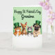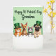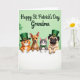 This card shows four sweet pets lined up across a pale green background dotted with small shamrocks, leaning over a bright white ledge as if they’ve just popped up to say hello 💚. Near the top, the message “Happy St. Patrick’s Day, Grandma,” sits centered in dark emerald lettering, standing out clearly against the light backdrop. On the left, an orange tabby cat wears a green top hat with a gold buckle, its wide eyes turned toward the group like it’s sharing a private joke. Beside it, a sturdy pug in a matching hat rests its paws on the ledge, giving the cat a side glance that feels like an old friend’s quiet grin ☘️. Between them, a fawn-colored, chihuahua-like dog leans forward with perked ears, as if eager to be included in the moment. On the right, a gray-and-white kitten wears a green bow tie, its soft gaze aimed toward the others in a gentle, companionable way. The overall scene keeps plenty of open space above the animals, while the crisp white ledge runs straight across the lower portion of the design.