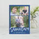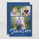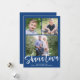 Detta moderna Rosh Hashanah-fotokort har en underbar blå färg-bakgrund med ett modernt kalligrafiskript i vitt. Hälsning på framsidan säger "Shana Tova". Den rymmer tre foton (två kvadratiska och ett vågrät). På baksidan finns en samordnande blå bakgrund som kan tas bort eller anpassas. Tips! Du kan lägga till ytterligare ett foto eller mer text på baksidan!