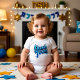 En skarp vit Baby Bodykostym designad för Rosh Hashanah har en djärv graffiti-stil "Shanah Tovah" i pulverblått. Graffiti-designen lägger till en modern, edgy tvist till den traditionella Julhälsningar, skapar Baby-bokostymen framträda med sitt urbana inspirerade utseende. Perfekt för spädbarn som vill fira Rosh Hashanah med stil, det dynamiska blåa brevet på den rena vita väven skapar en coola, contemporary vibe samtidigt som nyårskapets anda respekteras.