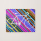 Denna pusseldesign presenterar en silhouette för vitfärgadcykel/skisserar formar, på ett vibrerande mång--färgat linjermönster.