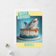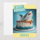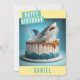Ett födelsedagskort med en haj-/Jaws-matad födelsedagskalas på framsidan med "Grattis på födelsedagen", fetstil med versaler. Anpassa fronten genom att lägga till ditt/dina namn. Insidan av kortet har plats för det skrivna eller handskrivna meddelandet.