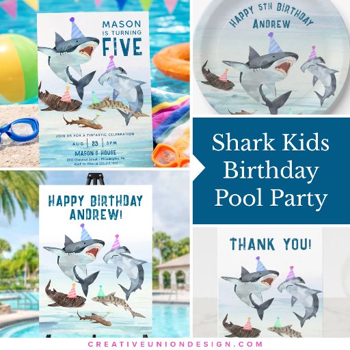 Thank all your sharks for swimming over to your birthday party! This design features a school of festive birthday sharks all wearing fun party hats! Easily edit with your personalized thank you message.