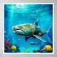 Experience an emotional underwater encounter with this detailed, stylized shark art print. The artwork showcases the ocean's apex predator gliding through sun-drenched deep blue light, contrasted by vibrant, colorful coral and tropical fish. This captivating scene masterfully blends power with the serene beauty of the marine environment, making it a compelling piece of ocean-themed decor. This truly unique design began with advanced AI generation and was then meticulously edited by a skilled artist to enhance its uniqueness, texture, and creative depth. This process ensures a distinctive, high-quality marine art print. Perfect for anyone who loves the ocean's mystery and power. Place your order today and embrace the joy of owning this exceptional piece!