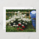 Shasta-Daisy kräver uppmärksamhet i trädgården bredvid det blå glaset. Blommigtens image fångad på MTBobbins Daylilies i New Hampshire.
