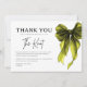 The minimalist green-and-white design reflects today’s most popular bow-themed and modern bridal aesthetics, making it easy to coordinate with your shower décor, invitations, signage, and tableware. Thoughtfully styled and easy to personalize, this thank you card feels refined, heartfelt, and effortlessly elegant.