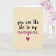 This card features a simple, funny love note on a warm beige background that looks like lightly textured paper. The message is centered in four short lines: “you are the she to my” on top, and “nanigans.” on the last line. The letters look like smooth, flowing handwriting, with most of the text in deep black. The word “nanigans.” stands out in bright magenta, making the joke feel extra sweet and memorable. Just below the words, there’s a small magenta heart that acts like a little finishing touch ❤️. The overall look is minimal, but it still feels personal, like something you’d write to someone you know well. It’s a meaningful card to give when you want to say “we’re a team” with a bit of humor and a lot of affection 🥰, and it’s a friendly way to share Valentine’s Day sentiments.
