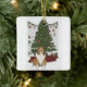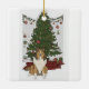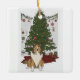 A cute Christmas tree ornament featuring a cartoon image of a sheltie in front of a Christmas tree