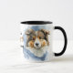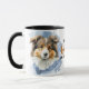 "Sheltie kisses fixa allt" deklarerar det här söta mugg för Shetland Sheepdog ägare. Bilden på vardera sidan är en vattenfärgsbild av en vidsträckt Sheltie. Hund placeras på en abstrakt blå vattenfärg stänk.