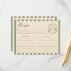 Birthday recipe enclosure card featuring a hand-drawn cake with bows and a coffee mug paired with elegant script and serif fonts in which your personalized information is written. The background is sage green stripes on a light background. Check out our store for more items from this collection.