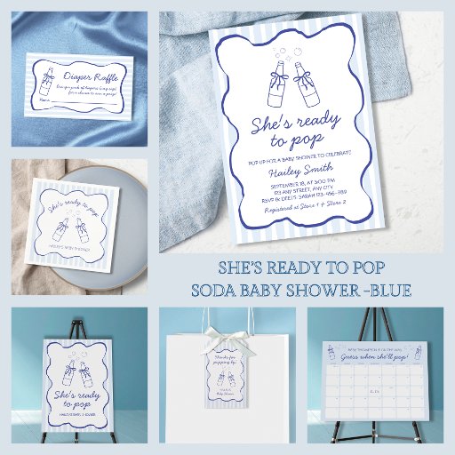 Invite guests to celebrate with this playful She’s Ready to Pop baby shower invitation. The design features cute hand-drawn soda bottles tied with little bows, a soft wavy frame, and a striped background in light blue and white. A handwritten-style font adds a warm, cheerful touch to the artwork. Perfect for a fun, lighthearted baby shower theme and easy to personalize with your event details.