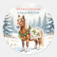 Topparna julklistermärken. Detta illustrerar en Shetland Pony som ligger i ett visstiskt helgdag under en snövinterdag med en bakgrund av gräs träd. Det är ett exempel på en vattenfärg i stil.