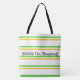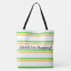 Designer-gåva till väskan med modern gult och grönt rand. Den vita bakgrunden kan ändras till färg och texten kan vara personlig eller borttagbar. Underbar shopping eller bärväska för marknad, livsmedel, skola eller strand.