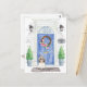 Meddela din ny adress med vårt meddelande om snyggt med ett långt hårkors Shih tzu, blå ytterdörr, välkomstmat, skiffertecken, utopier och en blommigt krans mot en grått-tegelbakgrund.