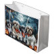 Släpp upp spookandan med den här eerie Halloween-designen med en hundar-förpackning under en mörk, månbelyst himmel, omgiven av flygande fladdermus och glödande pumpor. Perfekt för dem som kärlek en aning skrämmande roligt med sina hårigets vänner!