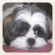 En gullig vit och svart lägga för den Shih Tzu hunden besegrar på en ro/en rosafilt. Den förtjusande Shih Tzu hund aveln Photograph avbildar tryck.