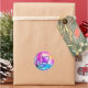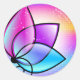 Rundklistermärken med en glansig vektorblomma i rosa, cyan och violett mot en ljus flerfärgad bakgrund.