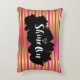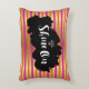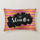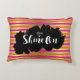 En söt kudde med en elegant mönster som består av rosa, orange och guld (faux) metalliskt rand. Överst är en svart splotch som säger "Shine On" i ett teckensnitt för trendiget finare, med en illustration av en vit romb.