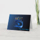 En moderniserande, metallisk, blå Chanukkah-menorah, med en lejon i silhouette, mot en mörk, natteliknande bakgrund. Alla nio ljusen är tända. Lägg till din egen text.
