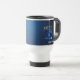 En moderniserande, metallisk, blå Chanukkah-menorah, med en lejon i silhouette, mot en mörk, natteliknande bakgrund. Alla nio ljusen är tända. Texten "Lycklig Hanukkah" står också i blått och vitt. Lägg till ytterligare text på baksidan.