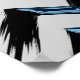 Den här designen har en lätt grått-bakgrund som korsas av breda, diagonala svarta penseldrag som skapar en känsla av rörelse och flöde. Placerade över dessa linjer är glandiga, tredimensionella blå former, liknar polerat glas eller kristallglas delart. Varje form justeras mot lutningen på de svarta linjerna, vilket ökar dispositionens visuella rytm. Kontrasten mellan de jämna, reflekterande blå formerna och det grova, dynamiska kanten på penseldragen skapar en slående blandning av modernitet och energi.
