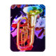Ett brassmarschband går förbi med vind instrument, inklusive den största och grymmaste, tuba. Tumbadet, som tagits på en slant vinkel, är en del av den portugisiska kyrkan i Hull (Gatineau) Quebec. Tubas spelar vanligtvis upp basnoterna på musiken arrangemangt. Det här bandet kommer från Montreal, Kanada. Jag kärlek-tuppar! Bäcktuba patenterades 1835 av ett par prusesar (i det som snart skulle bli Tysklant land); tenor tuba, några år senare, av en av uppfinnarnas son. Detta färgstarka mätarinstrument reflekterar träd, hus och människor i varningsklockan. Musikfotot av Sylvia Chaume, Kanada.
