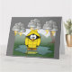 Penguin i gultens regn hatt och slickare som står i regnet i en puddle som blixten strejkor över, för att anpassa sig.