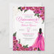 Quinceanera-inbjudan i shock rosa ro med accenter från guld och en flicka med elegant boll-gäss. Sök efter den här inbjudan hos flickor i olika hårtoner och färg.
