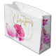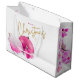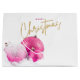 God jul-presentväska med shock rosa julbalkar, guld glitter-manustypografi och rosa orchid-blommar på vit bakgrund. Gör ett djärvt påstående med dina julklappar i år och lägg dem i den här snyggten. Mottagarna kommer att göra det i kärlek.