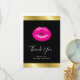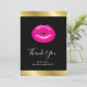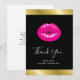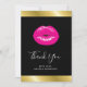 Tack för ett kort med en illustration med shock rosa läppar. Fet och pulserande bild. Ställ in på en svart bakgrund. En faux guld övertoningsremsa längs överkanten och grund gräns.