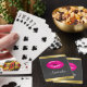 Spelkort med illustration som visar shock rosa läppar. Fet och pulserande bild. Ställ in på en svart, fläckig bakgrund. Faux glansig guld-övertoning gräns längs överkanten och grund (bara en bild).