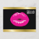 Ett vykort med illustration som visar shock rosa läppar. Fet och pulserande bild. Faux guld övertoning gräns längs överkanten och grund. Ställ in på en svart bakgrund.