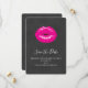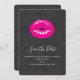 Bachelorette eller födelsedagsfest sparar datumkortet med en illustration med shock rosa läppar. Fet och pulserande bild. Ställ in på en svart, fläckig bakgrund.